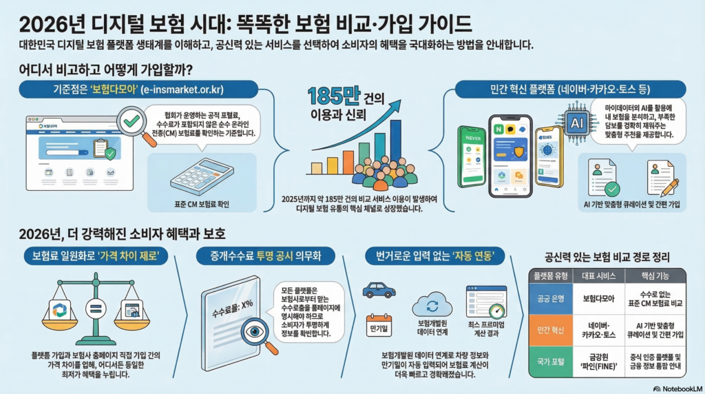 민간 플랫폼의 데이터 기반 매칭 기능을 활용하기 전, 금융소비자 정보포털 파인(FINE)이나 보험다모아에서 기준 가격을 먼저 확인하는 전략이 필요합니다. 이를 통해 민간 플랫폼이 제안하는 혜택이 실제로 얼마나 유리한지 냉철하게 판단할 수 있습니다.