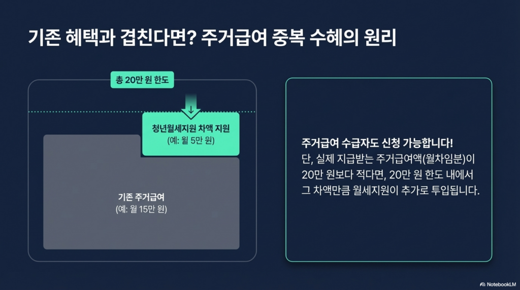 “이미 주거급여를 받고 있는데 중복 지원이 될까요?”라는 질문이 많습니다. 정답은 “차액만큼 가능하다”입니다. 이미 국가의 도움을 받고 있다는 이유로 신청조차 하지 않는 것은 20만 원의 권리를 포기하는 것과 같습니다.