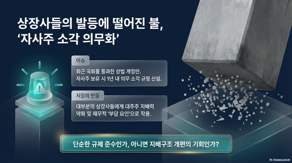 최근 자본시장의 뜨거운 감자는 단연 자사주 소각 의무화를 골자로 한 상법 개정안입니다. 자사주를 보유할 경우 일정 기간 내에 강제로 소각하도록 하는 이 법안에 대해, 많은 기업은 경영권 방어 수단이 위축된다며 심리적 압박감을 토로하고 있습니다. 소위 지배력 확대를 위한 자금줄이 막힌다는 우려입니다.