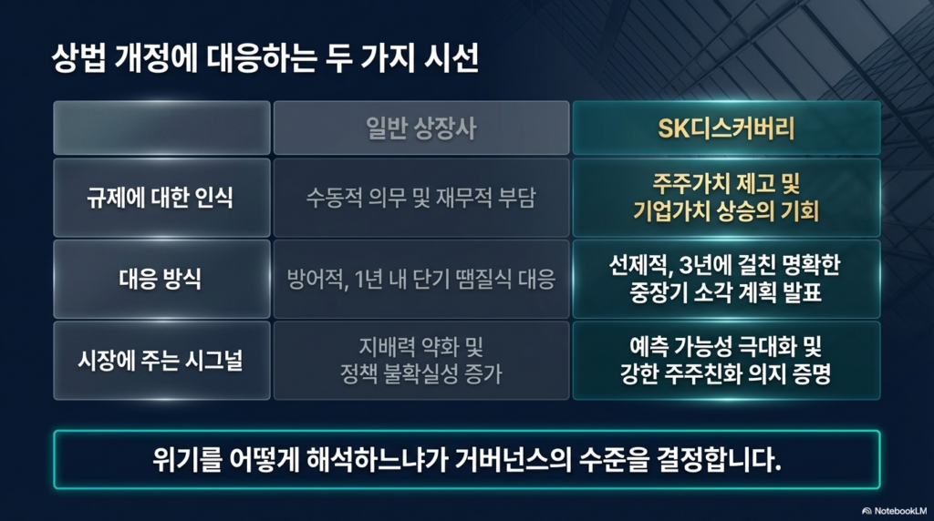 기업 지배구조 분석가로서 필자는 SK디스커버리가 상법 개정안이라는 외부 환경 변화를 대하는 태도에 주목합니다. 규제에 등 떠밀려 마지못해 행동하는 것이 아니라, 법의 취지에 발맞춰 선제적으로 중장기 계획을 공개하며 시장을 리딩하고 있습니다.