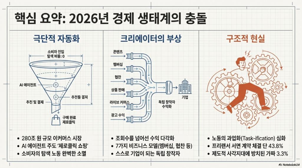 2026년의 기술은 우리에게 280조 원 규모의 쇼핑 편의성과 ‘제로클릭’이라는 혁신을 선사했습니다. 그러나 그 이면에는 ‘과업’ 단위로 쪼개진 노동의 파편화와 ‘가짜 프리랜서’라는 이름의 사회적 사각지대가 도사리고 있습니다. 기술이 제공하는 효율성의 수혜자인 동시에, 알고리즘에 의해 통제받는 노동의 주체라는 이중적 위치에 서게 된 것입니다.