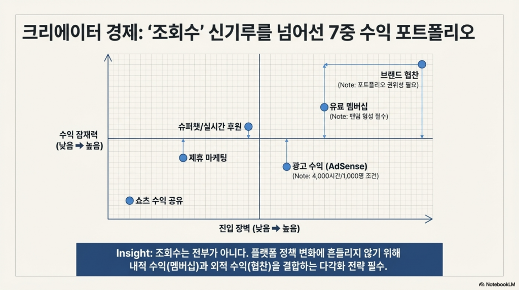 - 수익 다각화 모델: 광고 수익, 유료 멤버십, 슈퍼챗/스티커, 브랜드 협찬, 제휴 마케팅, 쇼츠 수익 공유, 플랫폼 외 사업(전자책, 강연).