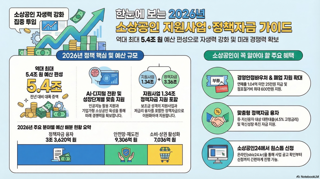 지원은 준비되었습니다. 신청은 ‘소상공인24(sbiz24.kr)’와 ‘소상공인정책자금(ols.semas.or.kr)’을 통해 가능합니다. 여러분은 이 5.4조 원의 기회를 발판 삼아 단순한 자영업자를 넘어 ‘기업가형 소상공인’으로 도약할 준비가 되셨습니까? 지금이 바로 그 시작점입니다.