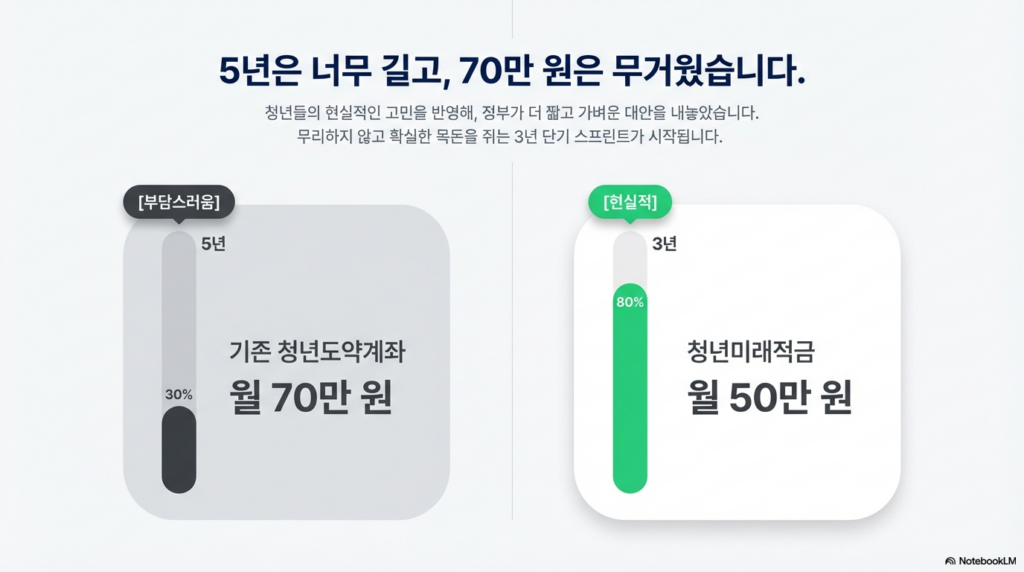 - 리스크 관리: 갑작스러운 자금 수요가 발생하더라도 3년은 비교적 견딜 수 있는 범위 내에 있습니다. “짧은 기간에, 무리하지 않고, 실질적인 목돈 마련”이라는 정책적 목표가 청년들의 라이프사이클과 비로소 합을 맞추게 된 것입니다.
