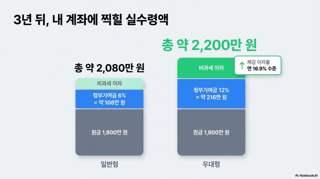 하지만 중소기업에 입사한 지 6개월 이내의 신규 취업자라면, 일반형 소득 요건(연 소득 6,000만 원 이하)만 충족해도 복잡한 검증 없이 ‘우대형’으로 자동 분류됩니다. 즉, 연봉이 4,000만 원인 사회초년생이라도 중소기업 신입 사원이라면 12%의 최고 기여율을 적용받아 3년 뒤 약 2,200만 원의 종잣돈을 쥘 수 있는 강력한 ‘치트키’가 부여되는 셈입니다.