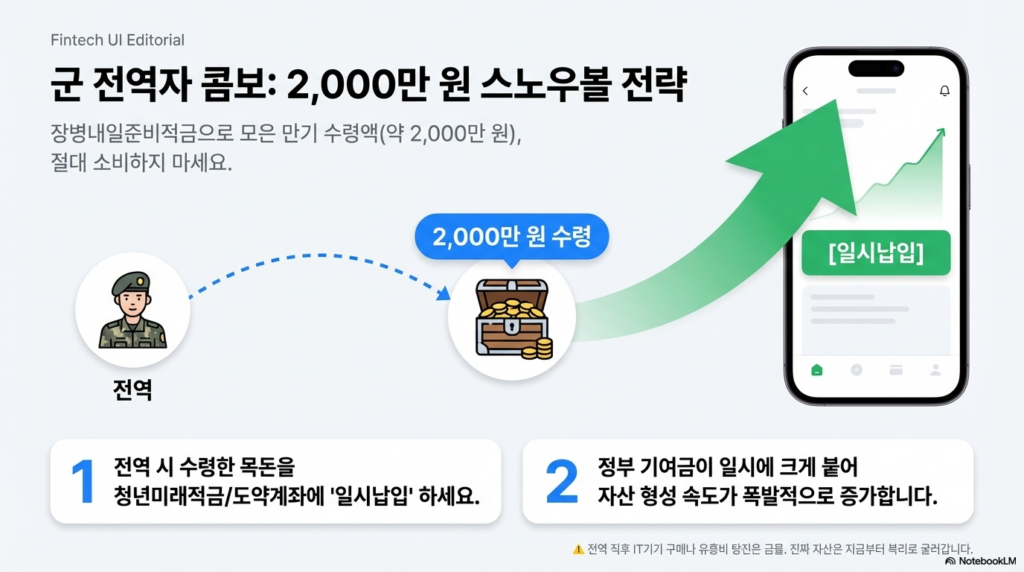 2026년에 전역하는 장병들이라면 ‘장병내일준비적금’ 만기 수령액(약 2,000만 원)을 청년미래적금에 ‘일시납입’하는 전략을 강력 추천합니다.