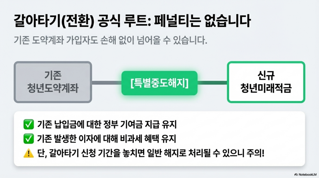 이미 5년 만기 청년도약계좌를 유지 중인 분들도 소외되지 않습니다. 정부는 ‘특별중도해지’ 제도를 통해 상품 전환의 길을 열어두었습니다.