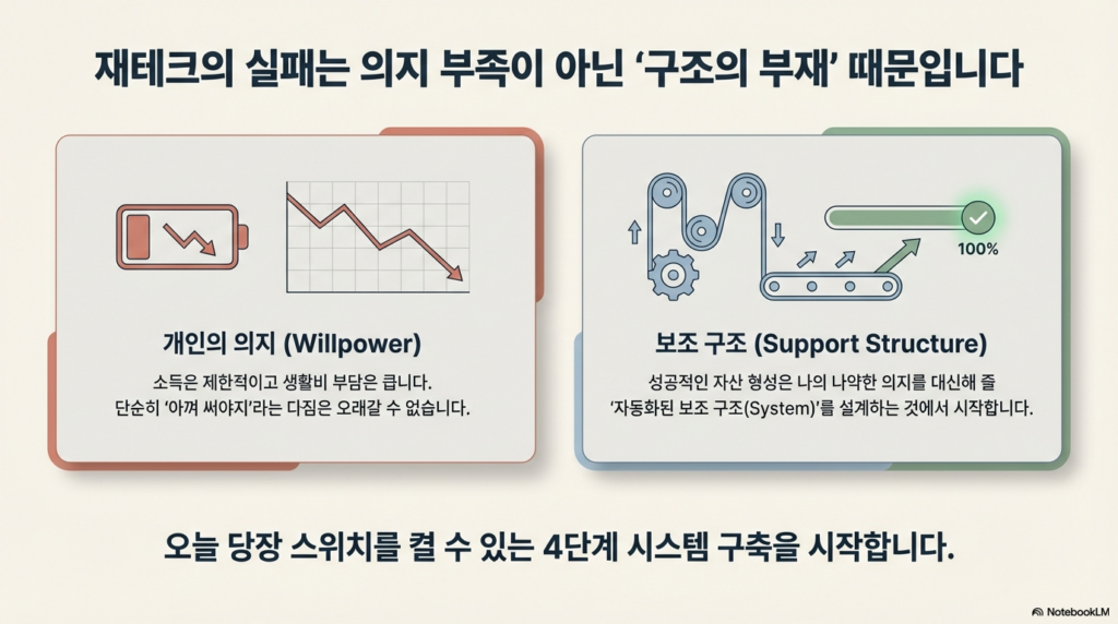 열심히 일하고 치열하게 아끼는데도 통장 잔고는 왜 늘 제자리걸음일까요? 많은 이들이 재테크의 성패를 개인의 의지와 인내력에서 찾으려 하지만, 사실 자산 형성의 본질은 노력이 아닌 ‘구조의 설계’에 있습니다.