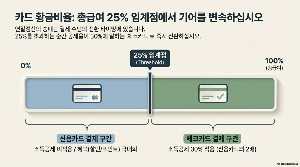 연말정산 혜택을 극대화하기 위해서는 지출의 양보다 ‘결제 수단의 타이밍’이 중요합니다. 핵심은 ‘총급여의 25%’라는 기준점과 ‘300만 원’이라는 공제 한도입니다.