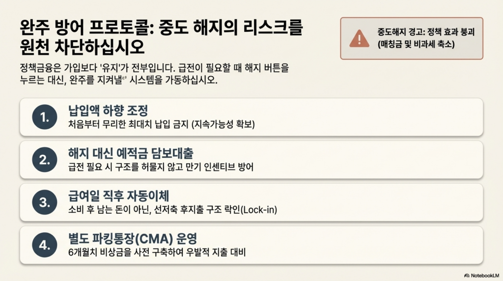 [Editor’s Tip] 중도 해지의 유혹을 이기려면 자동이체 날짜를 급여일 직후로 설정해 ‘남는 돈’이 아닌 ‘없는 돈’으로 인식하십시오. 만약 급전이 필요하다면 해지 대신 적금 담보대출을 활용해 만기 시 받을 정부 매칭금과 비과세 혜택을 지키는 것이 진정한 전략입니다.